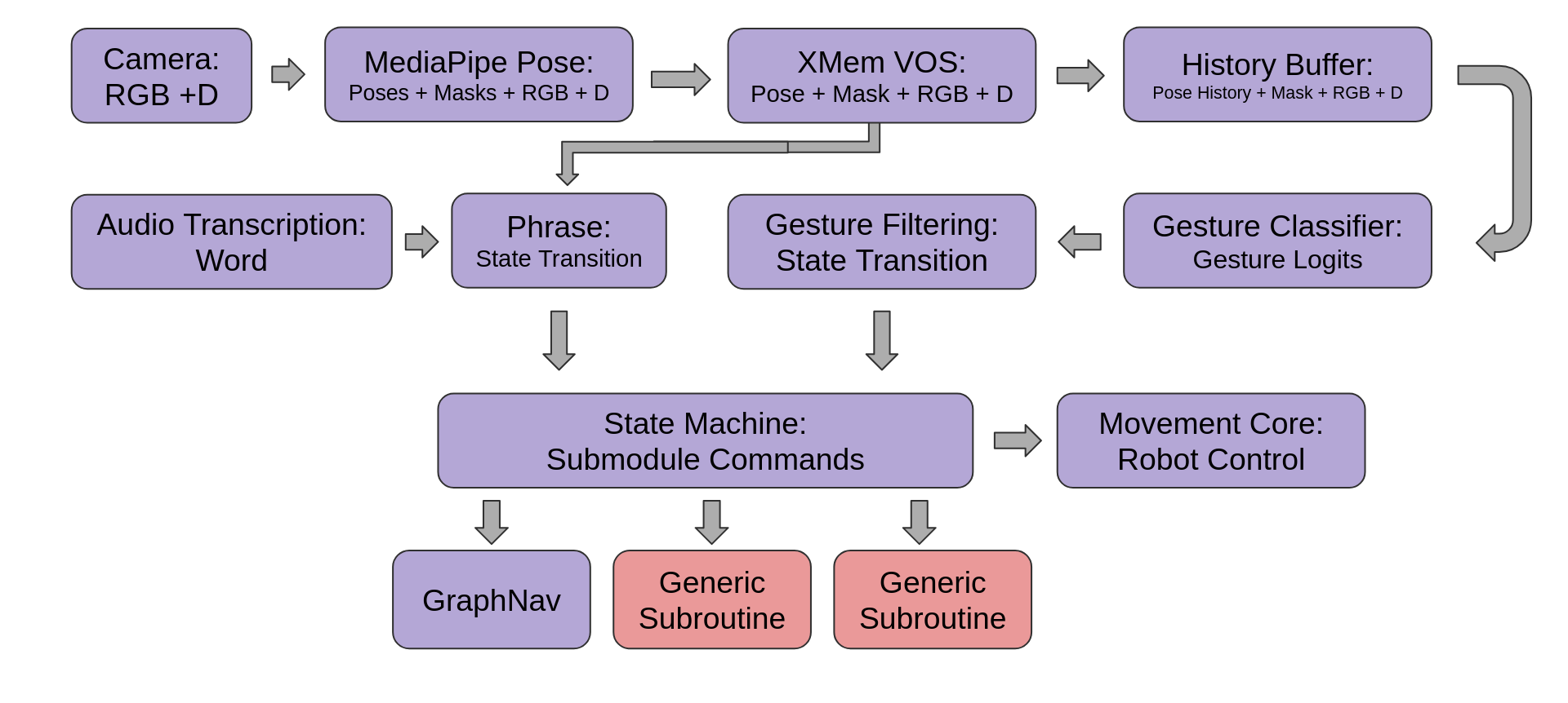 MediaPipe creates a segmentation mask of the first human to make a T pose. XMem is used to propagate the original segmentation mask throughout time, leading Spot to be robust to distractions in crowded environments and occlusions. Even with multiple humans in the scene, Spot can follow the controller, even after they are completely occluded.